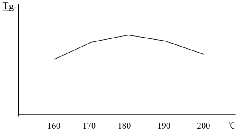 產(chǎn)品層壓時的固化溫度對基板的Tg 影響很大。我們對FR- 4 層壓時的固化溫度與基板的Tg 做了一個對比試驗, 層壓時的固化溫度分別取160℃,170℃,180℃,190℃,200℃, 相同的層壓壓力, 保溫時間都是60min。我們發(fā)現(xiàn)基板的Tg 在固化溫度180℃時為最高(見圖67)。溫度低于180℃,由于基板固化不充分,所以其Tg 偏低;溫度高于180℃,樹脂將開始出現(xiàn)降解,溫度越高,降解現(xiàn)象越嚴重,所以其Tg 偏低,基板也開始發(fā)黃。