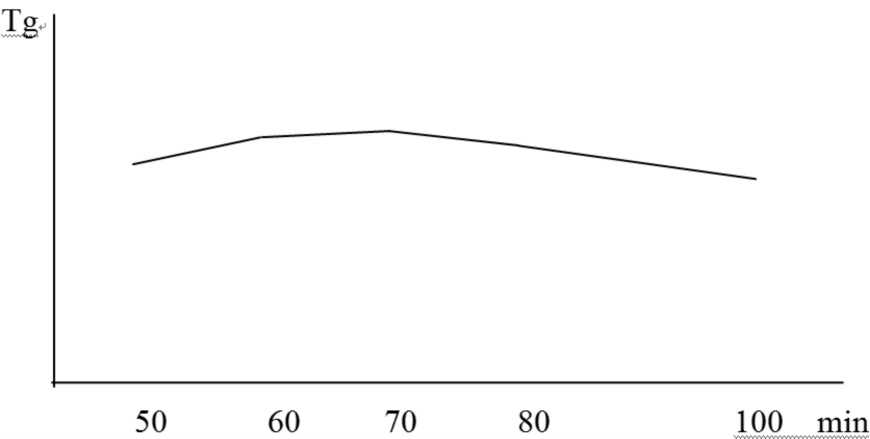 產(chǎn)品層壓過程固化時間對基板的Tg 的影響,與固化溫度相類似。我們做了以下試驗:在相同固化溫度與層壓壓力下,不同固化時間對基板Tg 影響的對比試驗。層壓固化時間分別取50min,60min,70min,80min,100min,采用相同的層壓壓力,保溫時間都是60min。我們發(fā)現(xiàn)基板的Tg 在固化時間70min 時為最高(見圖67)。時間低于60min,由于基板固化不充分,所以其Tg 偏低;時間高于80min,樹脂將開始出現(xiàn)降解,溫度越高,降解現(xiàn)象越嚴重,所以其Tg 偏低。從圖上看,固化溫度對基板Tg 的影響明顯大于固化時間。