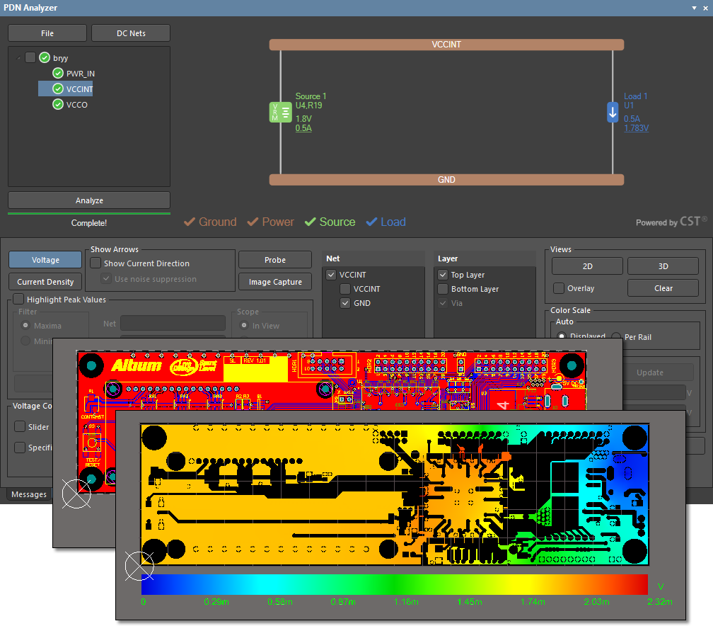 在電力傳輸和熱管理方面,使用電力傳輸網(wǎng)絡(luò)分析儀(PDNA)可以確定整個(gè)走線,電源和接地層以及過(guò)孔的IR損耗。您的PDNA應(yīng)使用直觀的輸出格式產(chǎn)生電壓和電流密度結(jié)果。最好的工具將向您顯示交互式彩色地圖,使您可以直觀地檢查您的電路板是否存在潛在的電源熱問(wèn)題和過(guò)多的IR壓降。